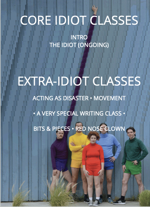 We break the classes into two categories: Core Idiot and Extra-Idiot. The Core Idiot classes contain all the original Idiot principles and the Extra-Idiot classes take Idiot principles and apply those to other disciplines like writing, movement, scene work, creating bits, etc. Once you have passed INTRO you can join an ongoing class (simply called “The Idiot”) where we encourage you to stay for as long as you are feeling challenged. If you are interested in taking one of the Extra-Idiot classes you can join those at any time with no prerequisite. All classes, unless otherwise stated, run in six-week blocks.